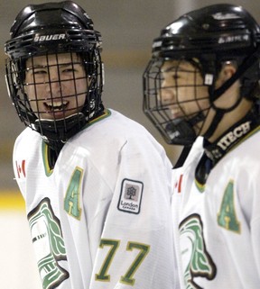 The Lucas Vikings played the St. Thomas Aquinas Flames in TVRA senior boys high school hockey at Stronach arena in London on Monday. Photos by LFP’s Derek Ruttan druttan@postmedia.com